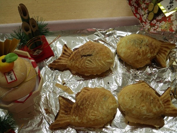 おやつタイムは、寮内で『たい焼き屋さん』を開店。たい焼きを食べて、「今年も愛(め)でたい一年となりますように」と、『なのはな神社』にも願いを込めてお賽銭を入れました。