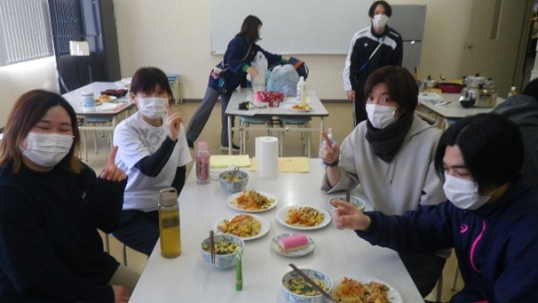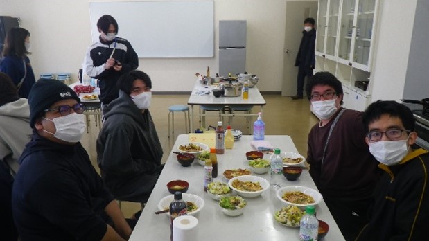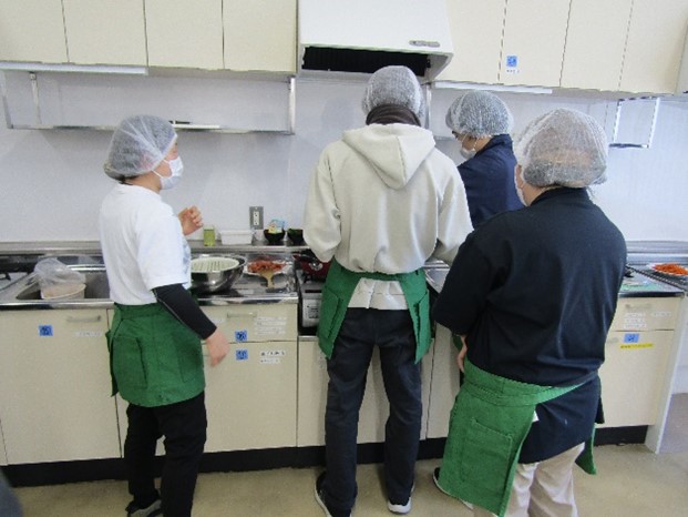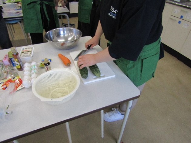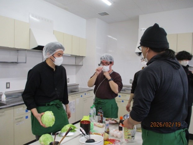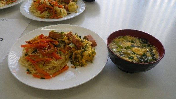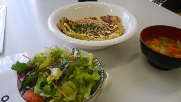 新規職員チームは沖縄出身の職員がいたので、『ゴーヤチャンプルー』と『ソーミンチャンプルー』、おばあ(祖母)が作ってくれた『にゅうめん風』の3品を作りました。一方、中堅職員チームは、大阪に住んでいた職員がいたので、『お好み焼き』と『サラダ』、『野菜スープ』の3品で挑みました。